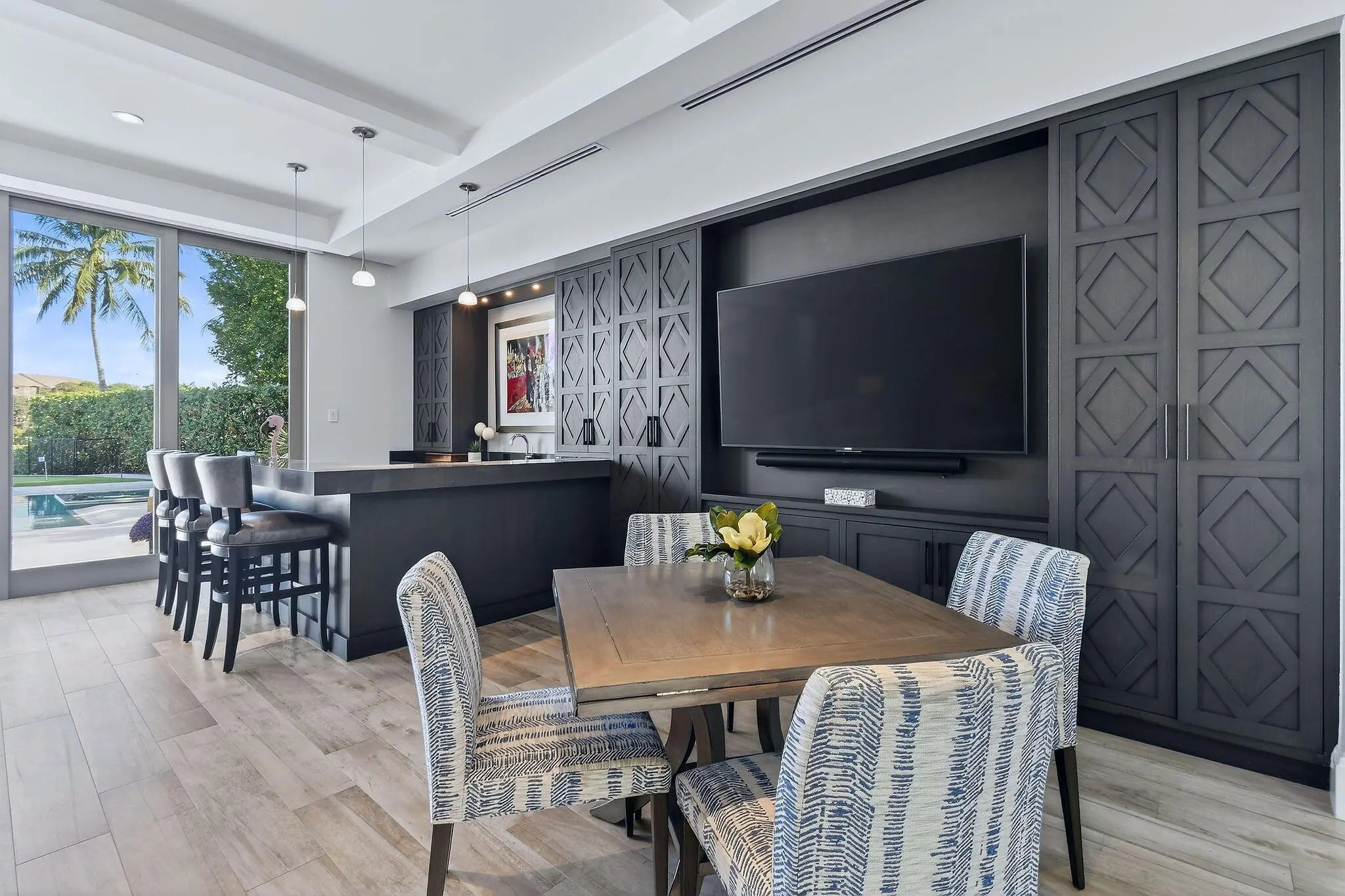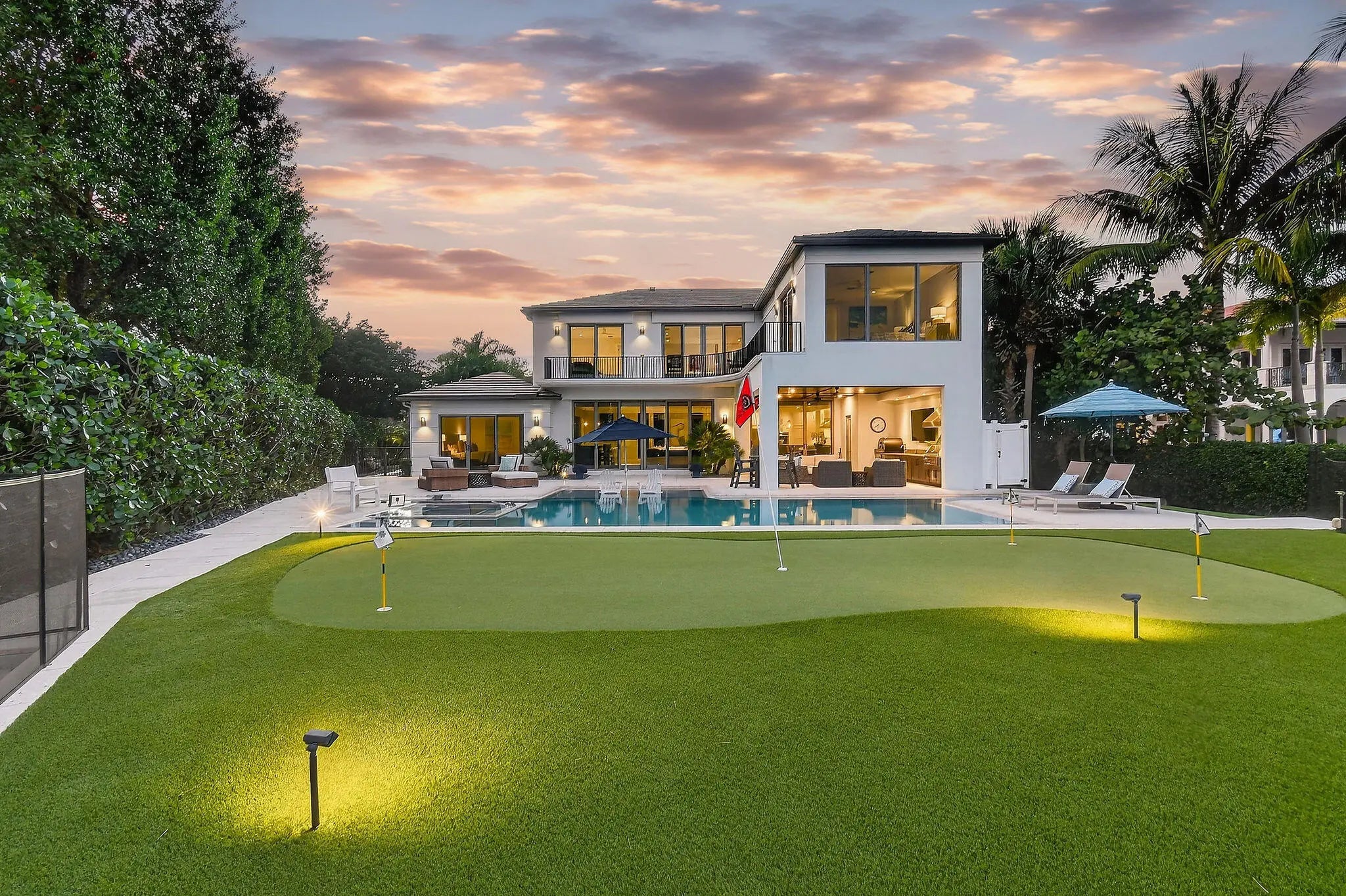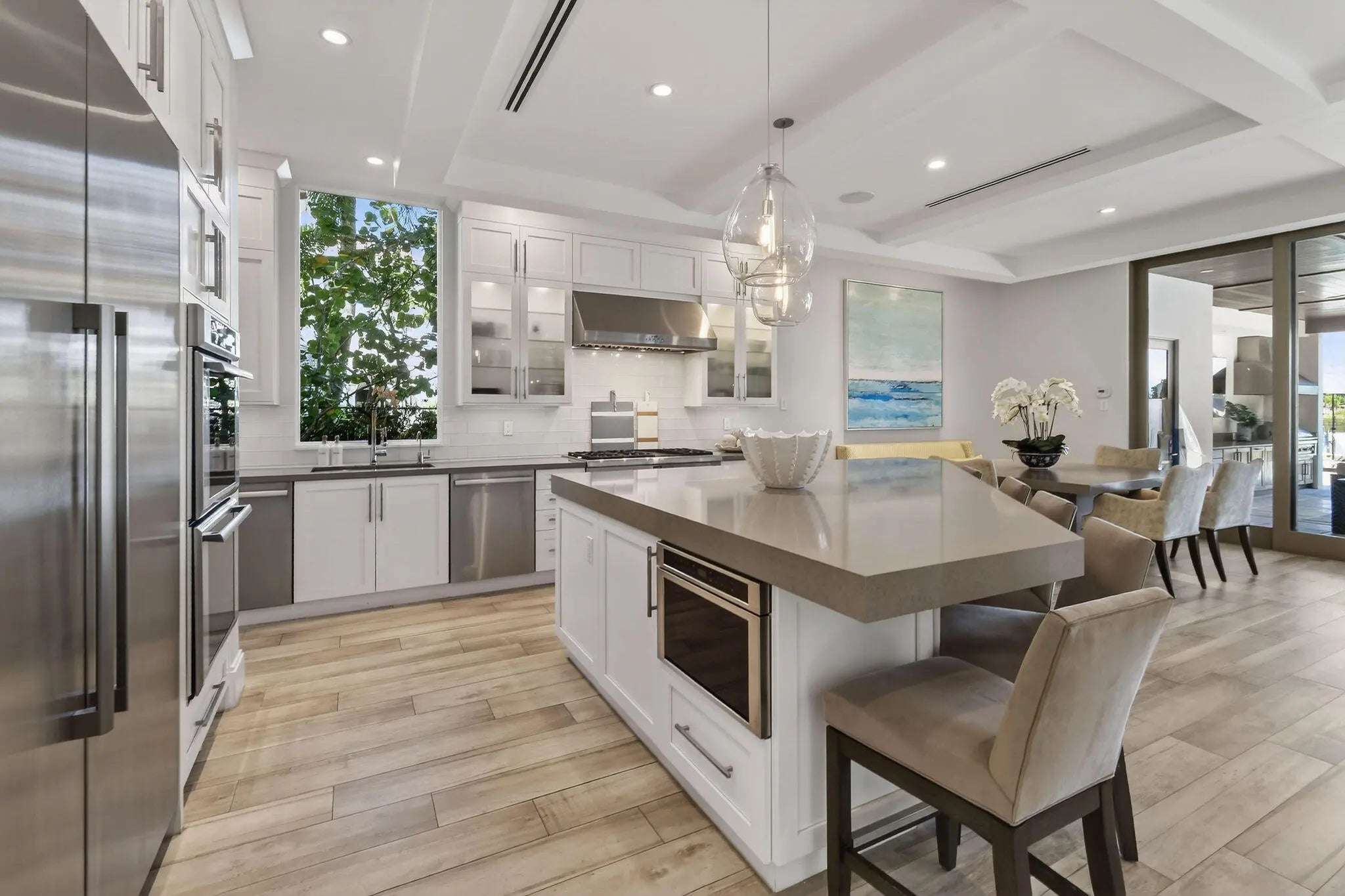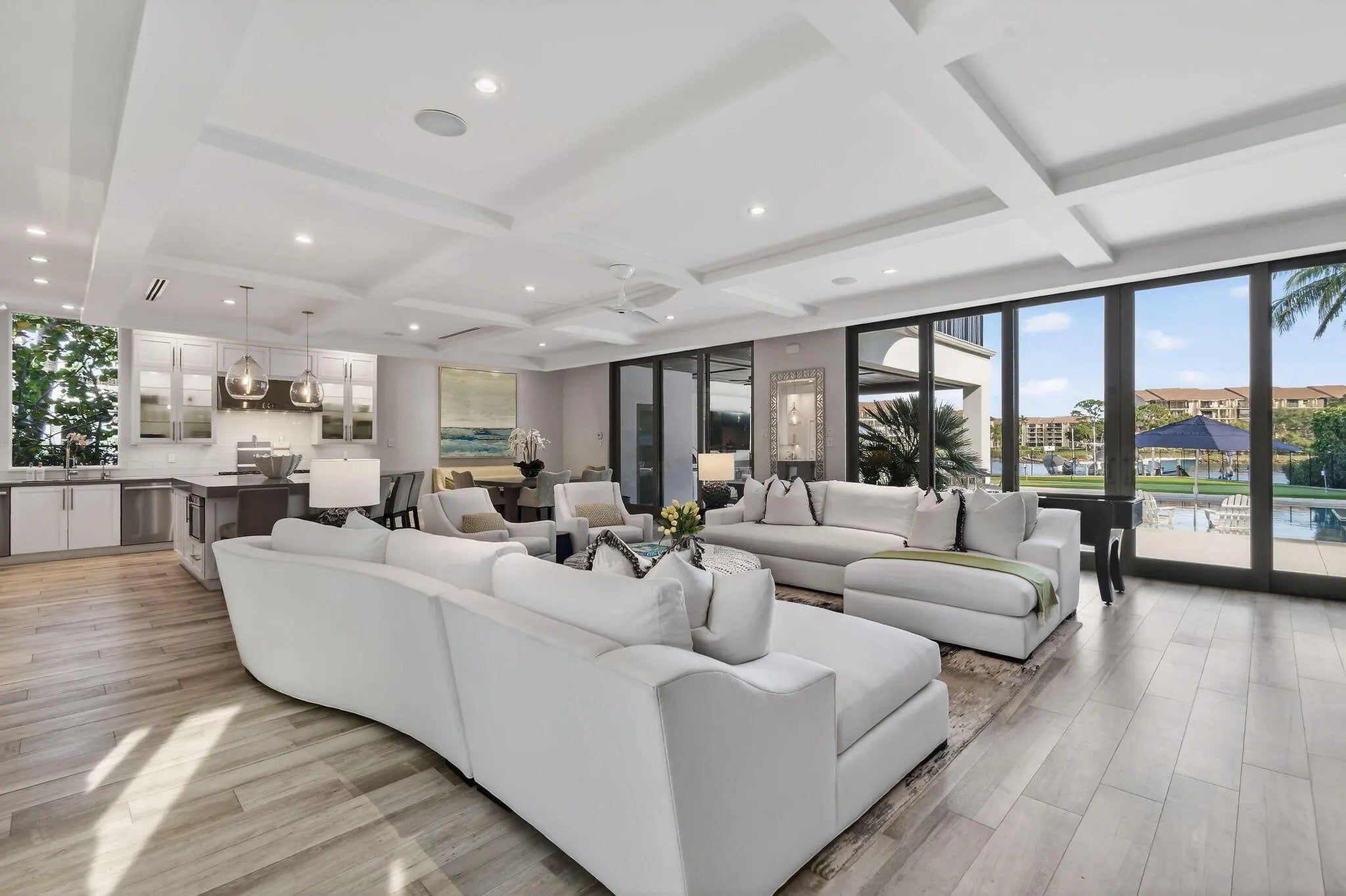 Set behind the gates of an intimate waterfront enclave, this beautifully renovated Intracoastal estate offers a rare blend of scale, privacy, and lifestyle. Positioned on an expansive three-quarter-acre lot with direct, east-facing water frontage, the home captures sweeping views of South Florida's most coveted waterway from multiple vantage points. Designed to feel both inviting and expansive, the residence features approximately 5,000 square feet of living space with six bedrooms, four full baths, and two half baths, complemented by a three-car garage. Multiple living and entertaining areas allow for comfort and privacy, making the home equally suited for quiet evenings or hosting family and friends. Outdoor living is a true highlight, with amenities curated for both relaxation and