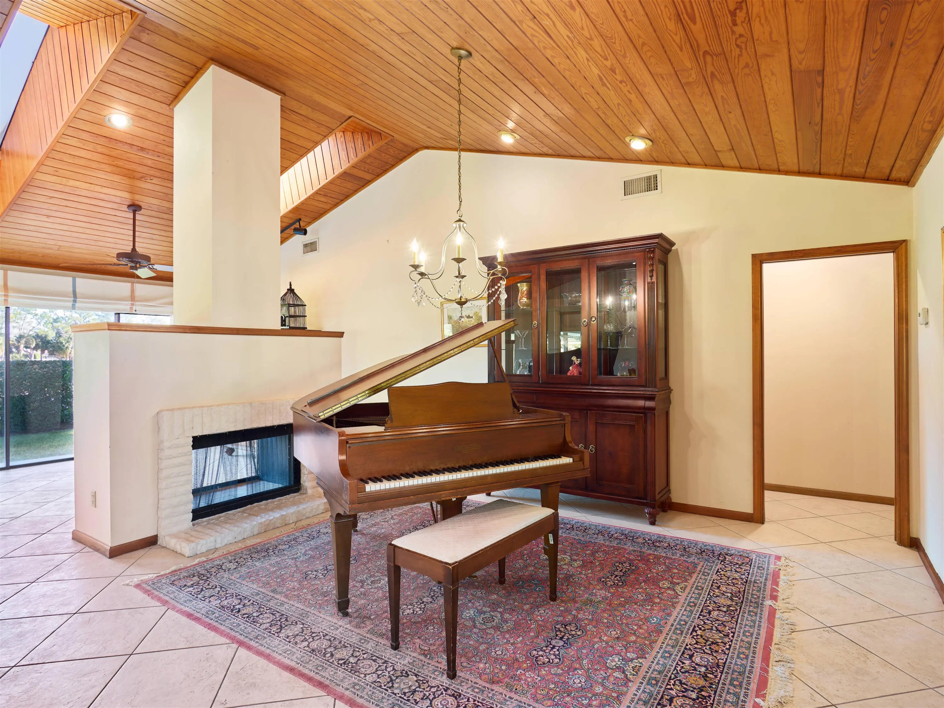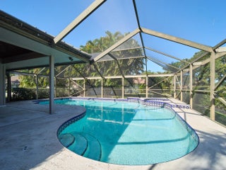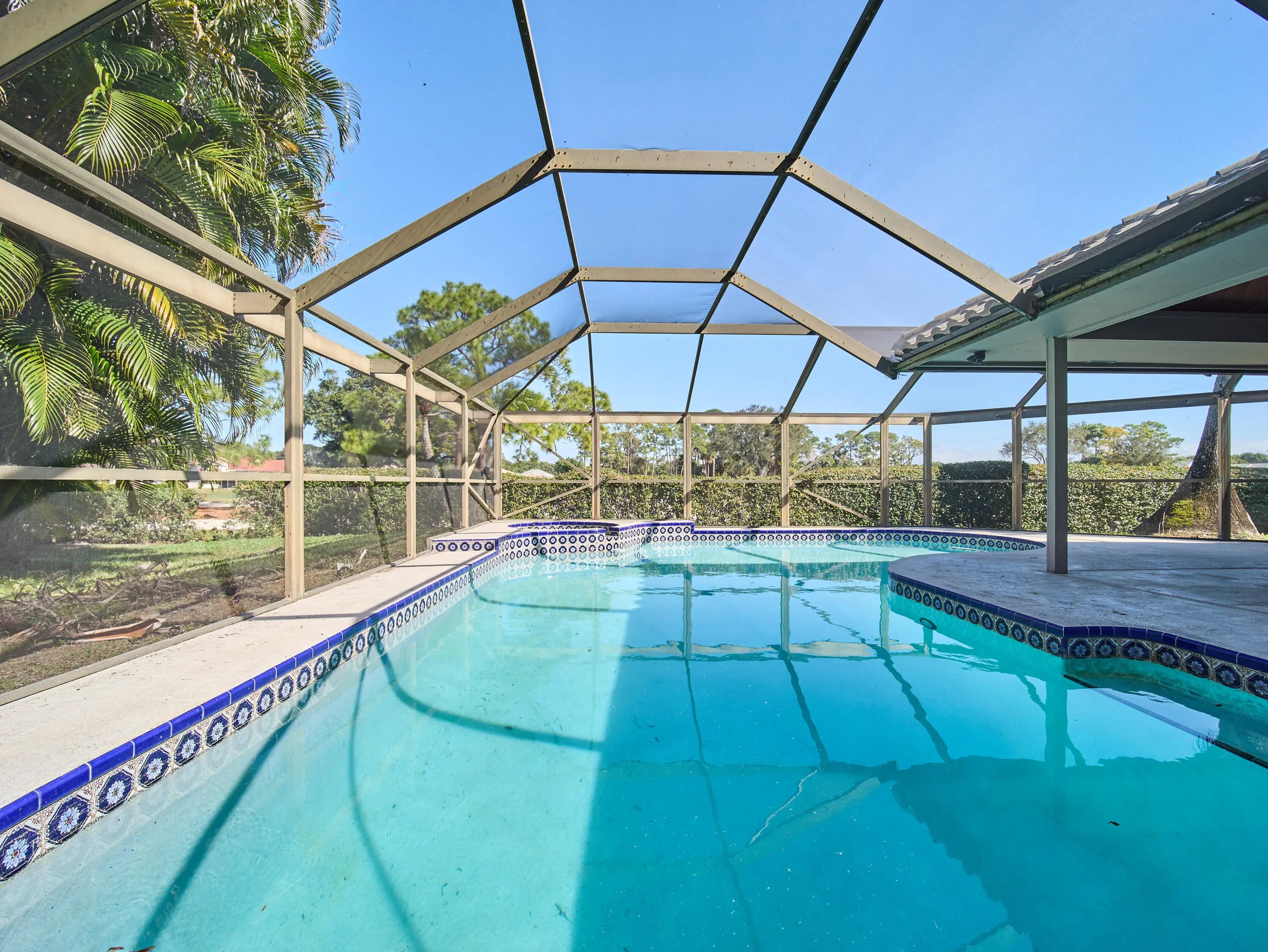 Rare opportunity in Marlwood Estates at PGA National! This one-story 4BR/3BA residence with a dedicated office offers 2,788 SF under air on a 13,704 SF lot, ideally situated on The Match golf course. The home features vaulted, wood-paneled ceilings with skylights in the kitchen and family room, a striking dual-sided fireplace, and a spacious layout with excellent bones, perfect for renovation or reimagining. Enjoy a covered and screened patio with pool and spa overlooking serene golf views, ideal for indoor-outdoor living. Additional highlights include a 2022 roof, partial impact windows, accordion shutters, and a 2-car garage. Located within the prestigious PGA National community, this property presents a compelling value-add opportunity for investors or buyers looking to customize in a