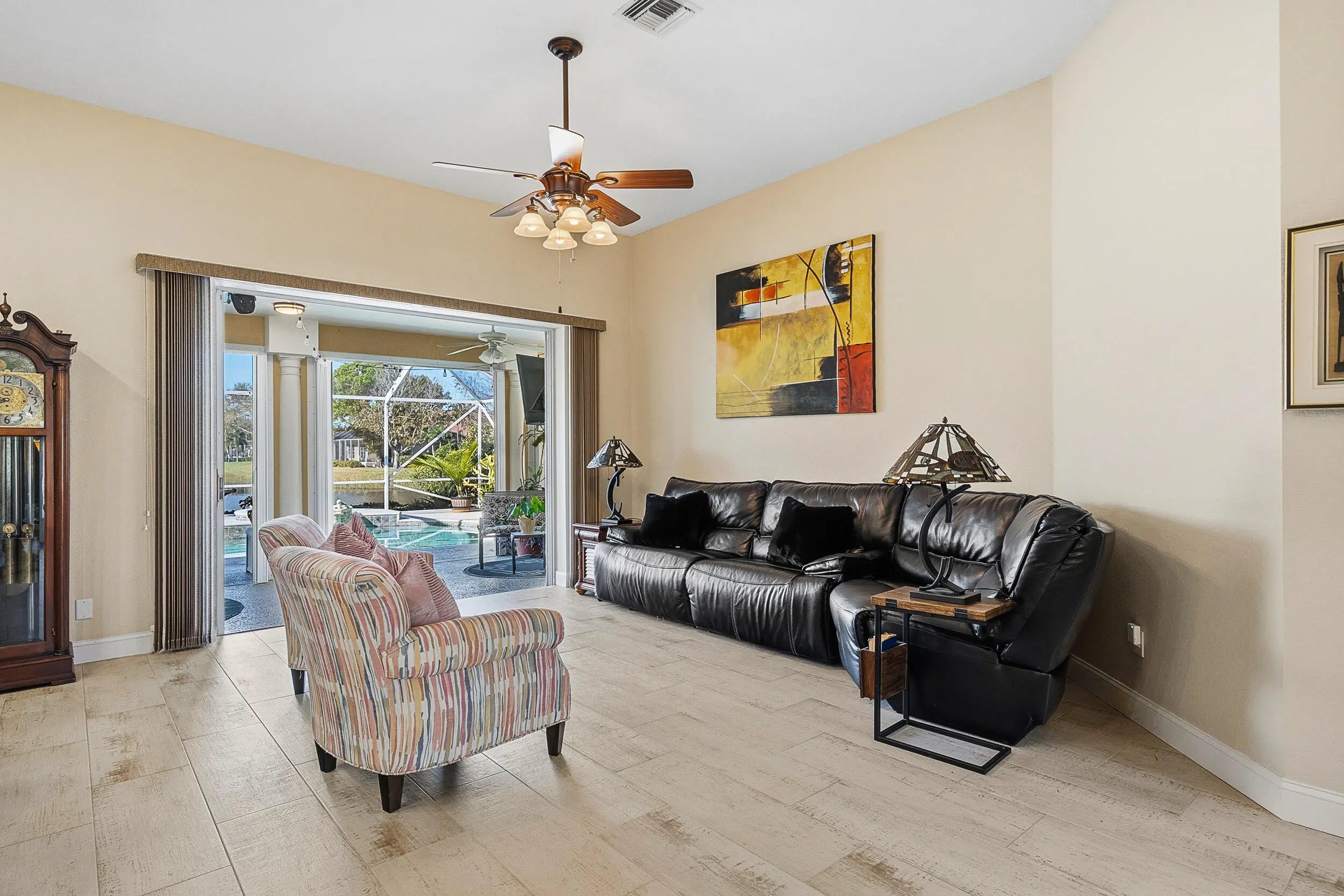 Experience refined living in this beautifully updated pool home set along a picturesque lake in a prestigious, tree-lined gated golf club community, conveniently close to shopping, dining,and everyday conveniences, this home delivers both luxury and lifestyle. High ceilings enhance the light-filled interior, showcasing a stunningly updated kitchen, elegant baths, and designer wood-look plank flooring. The home also features a versatile flex space offering endless possibilities and is ideal for use as a den, home office, sitting area, playroom or recreation room. Outdoors, an inviting, expansive living space with pool and spa overlooks the serene lake, where spectacular sunset views create an unforgettable backdrop.