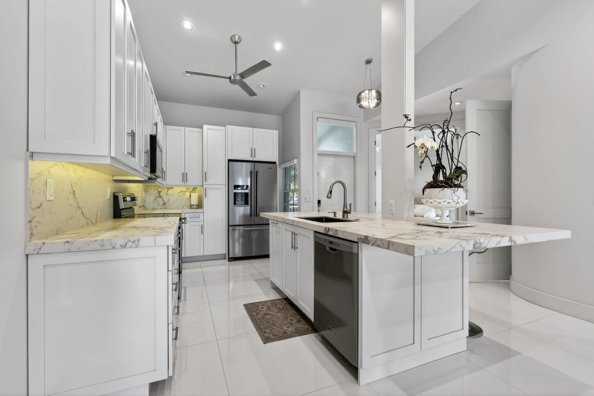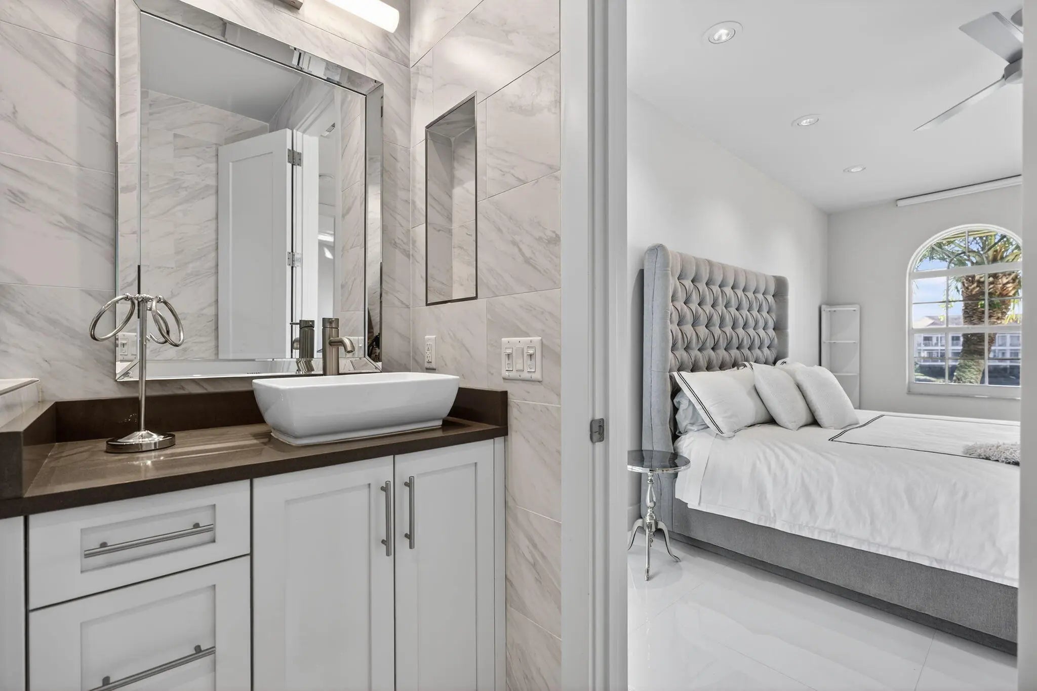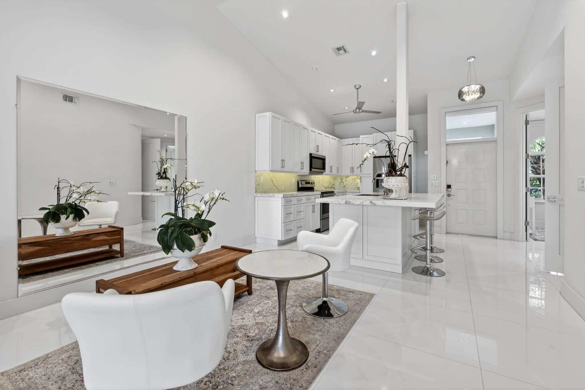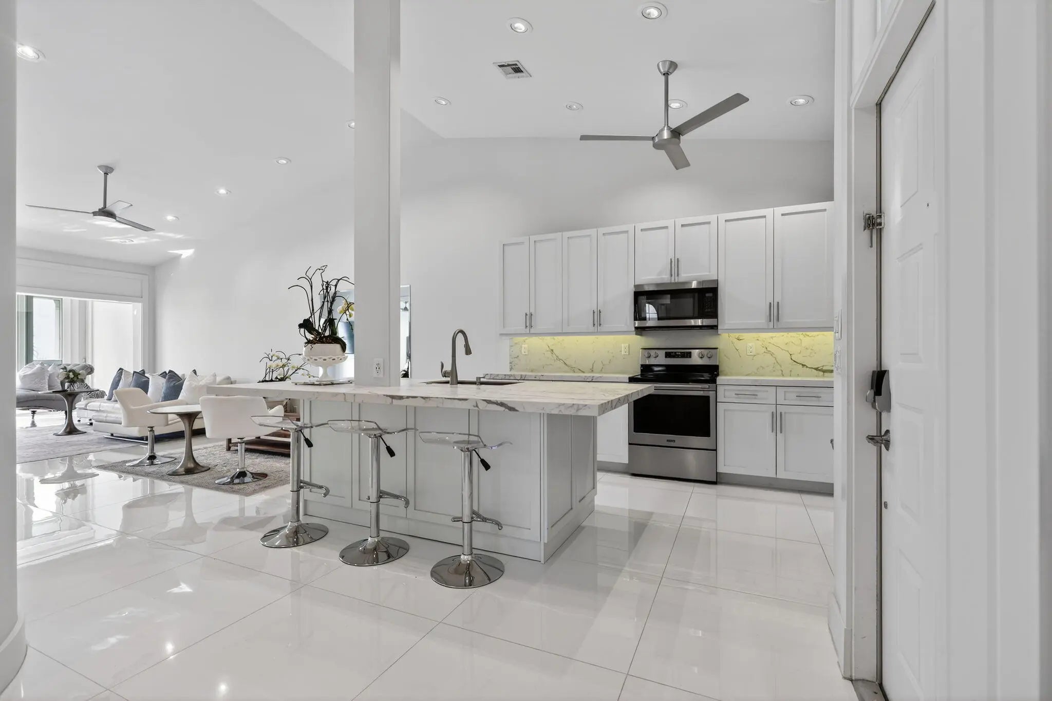 Welcome to this FULLY RENOVATED residence in the world-renowned PGA National Resort, one of Palm Beach Gardens most prestigious and iconic golf communities. This exceptional home underwent a complete top-to-bottom renovation in 2018, offering elevated design, premium finishes and a European feel.Bathed in natural sunlight throughout the day, the home enjoys tranquil lake views with moving water, creating a peaceful and visually stunning backdrop from the main living areas and the expanded patio.The interior features new drywall throughout, 8 ft custom wood interior doors, 6 inch custom base moldings, 42 recessed high-hat led lights, nest and 36 x 36 porcelain tile flooring. These features effortlessly enhance your indoor/outdoor living experience.