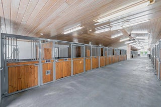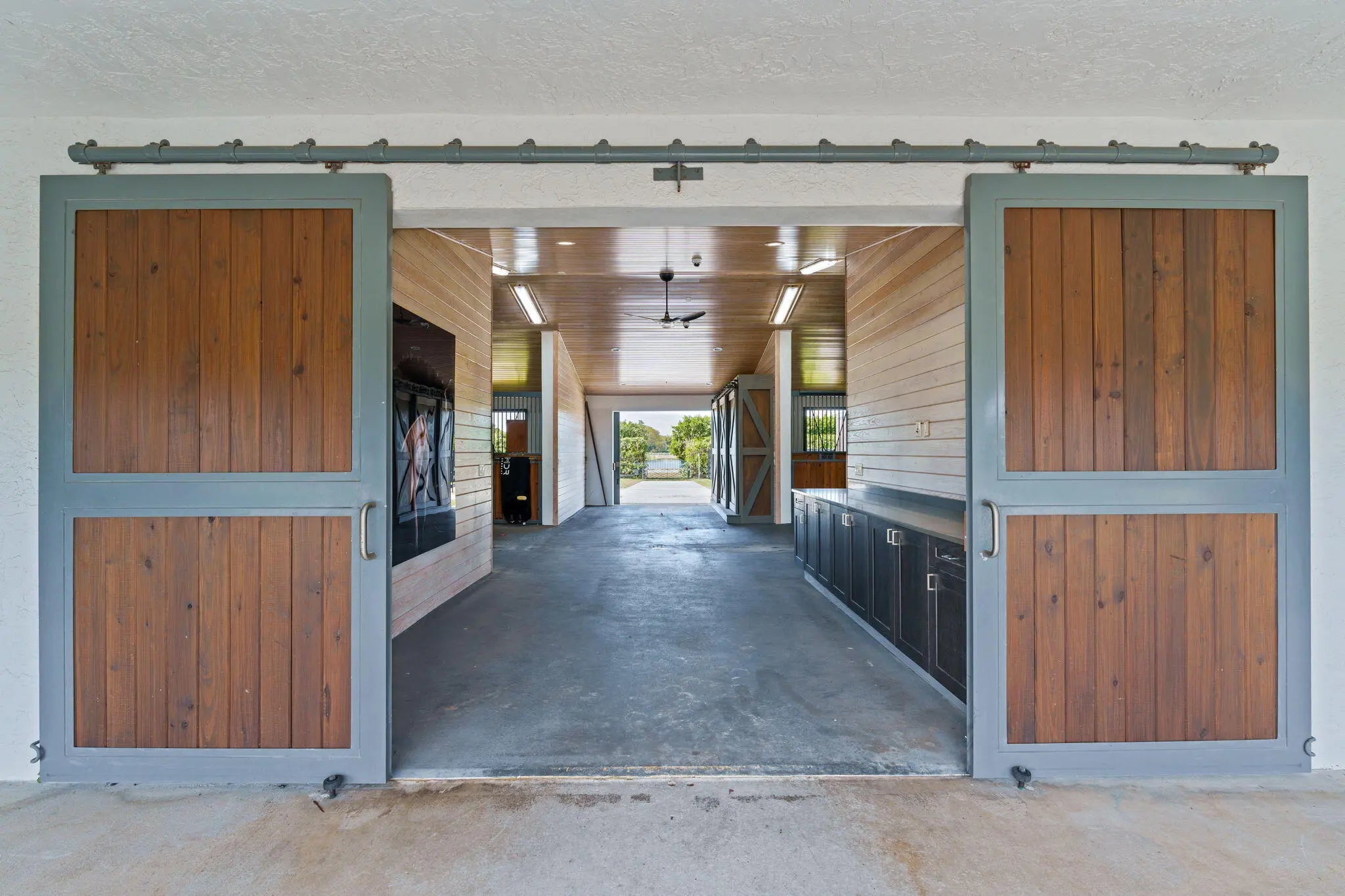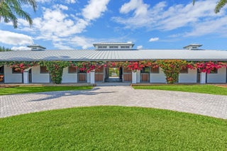 Tucked away in a quiet, secluded setting yet optimally positioned near the horse show, this exceptional farm offers the rare combination of privacy and convenience. From the moment you pass through the gates, it is clear this is a special property, framed by lush bougainvillea and beautifully curated landscaping that feels both welcoming and picturesque. Spanning just over 5 acres, the farm is thoughtfully designed and impeccably maintained. A standout feature is the oversized mirror arena, mostly covered and equipped with all-weather fiber footing, making it ideal for year-round training. The property includes 38 total stalls, with a 24-stall main barn featuring a center aisle and 14 additional stalls in a separate rear center-aisle barn. Abacus cushion stall flooring