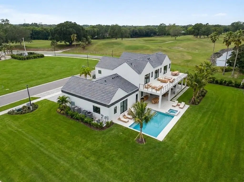 Welcome to Farrell Estates, an elite collection of 27 bespoke residences within the prestigious Palm Beach Polo Club. Introducing Lot 1, a masterpiece of modern luxury boasting premier, unobstructed views of the historic old golf course. This residence epitomizes Hamptons-style indoor-outdoor living, centered around an expansive open floor plan. Walls of glass and sliding doors invite natural light to dance across wide-plank light oak floors and stunning quartzite surfaces. The chef's kitchen features custom cabinetry, while the downstairs Junior Suite offers serene pool and spa vistas. Complete with a three-car garage and over 1,000 sq. ft. of covered patio space, this home is designed for the most discerning lifestyle enthusiast. Experience the pinnacle of Farrell Estates.
