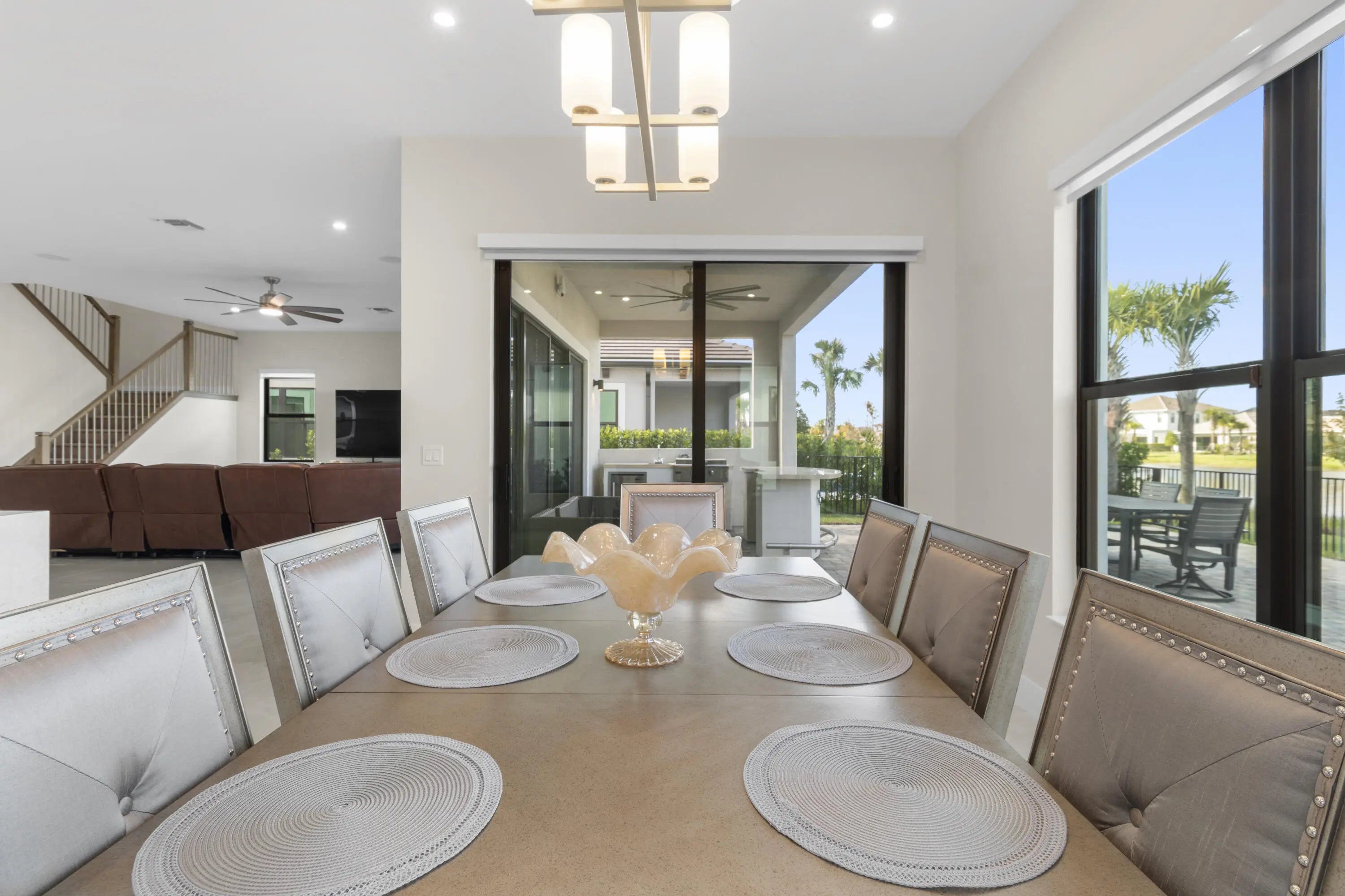 Step into unparalleled luxury with this Santa Monica masterpiece, completed March 2025. This 5-bed, 6-bath estate features elite upgrades and a layout built for grand-scale entertaining. Highlights include a custom home bar, chef's kitchen with gas cooking and oversized social island, and an ultra-premium outdoor kitchen ideal for lakeside hosting. The primary suite offers dual baths, dual walk-in closets, and a private balcony overlooking the fountain. All guest suites include private baths. Generator-ready and pre-wired for interior and exterior cameras. Move into this designer-finished jewel. Private tours by appointment.