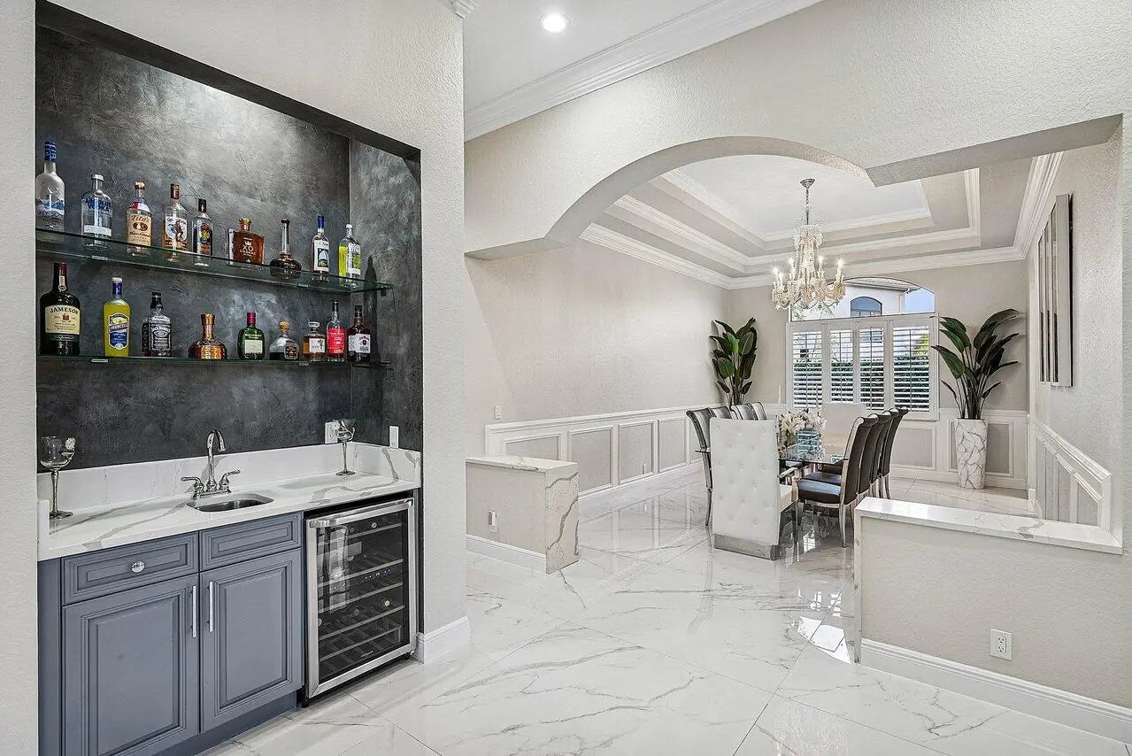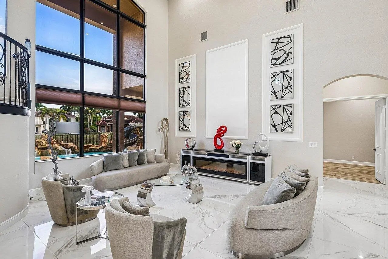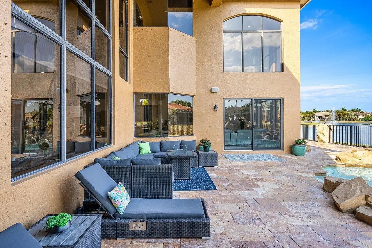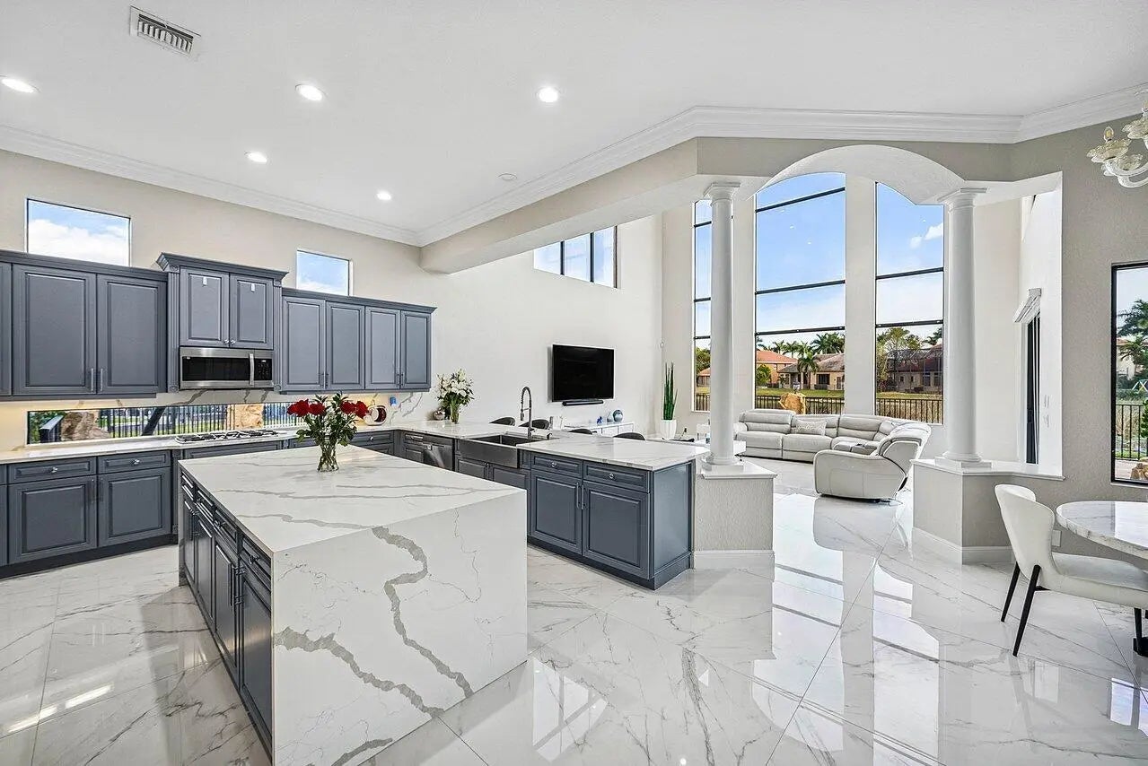 European elegance meets modern sophistication in this exquisitely updated Marseilles estate, ideally positioned on a quiet 17,000 sq ft cul-de-sac lot with sweeping lake views in Versailles. Soaring ceilings, dramatic windows, and polished Italian porcelain tile create a breathtaking first impression, with panoramic views of the resort-style pool and water beyond. Offering over 6,300 square feet, this thoughtfully designed home features 5 bedrooms, 6.5 baths, a private office, loft, media theater, and oversized 3-car garage. The stunning gourmet kitchen showcases waterfall quartz countertops, natural gas cooktop, double wall ovens, Miele built-in coffee system, custom cabinetry, apron sink, and walk-in pantry -- all flowing seamlessly into the expansive family room and casual dining area