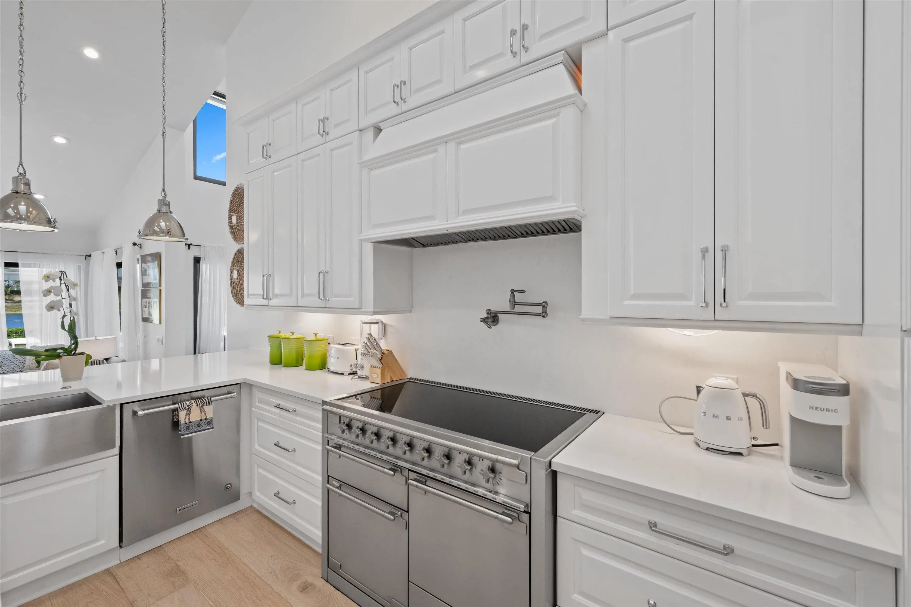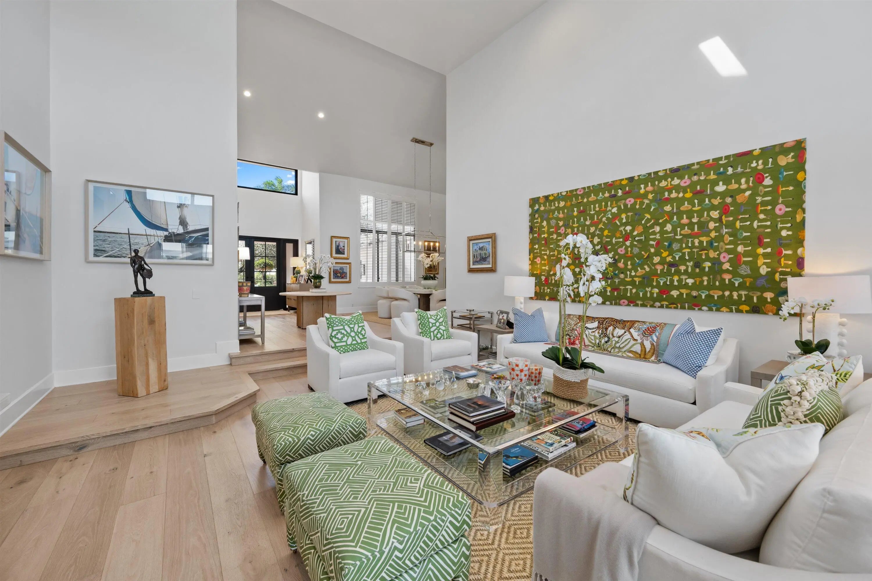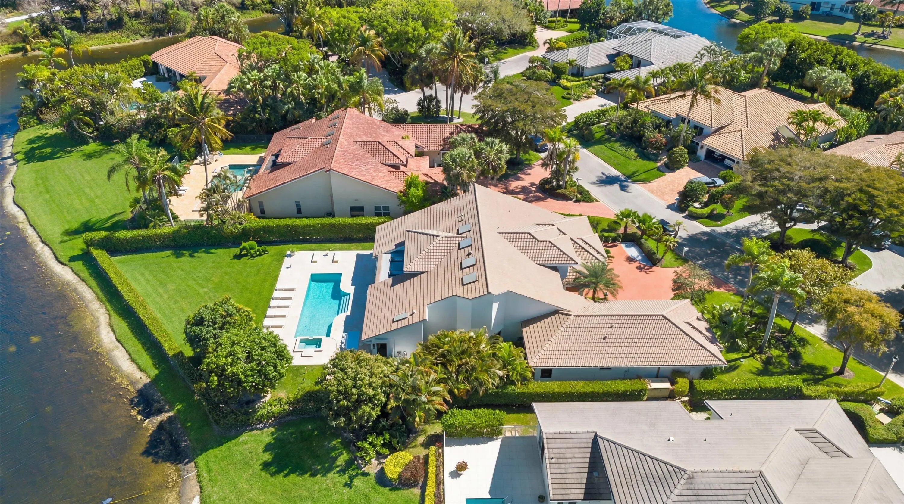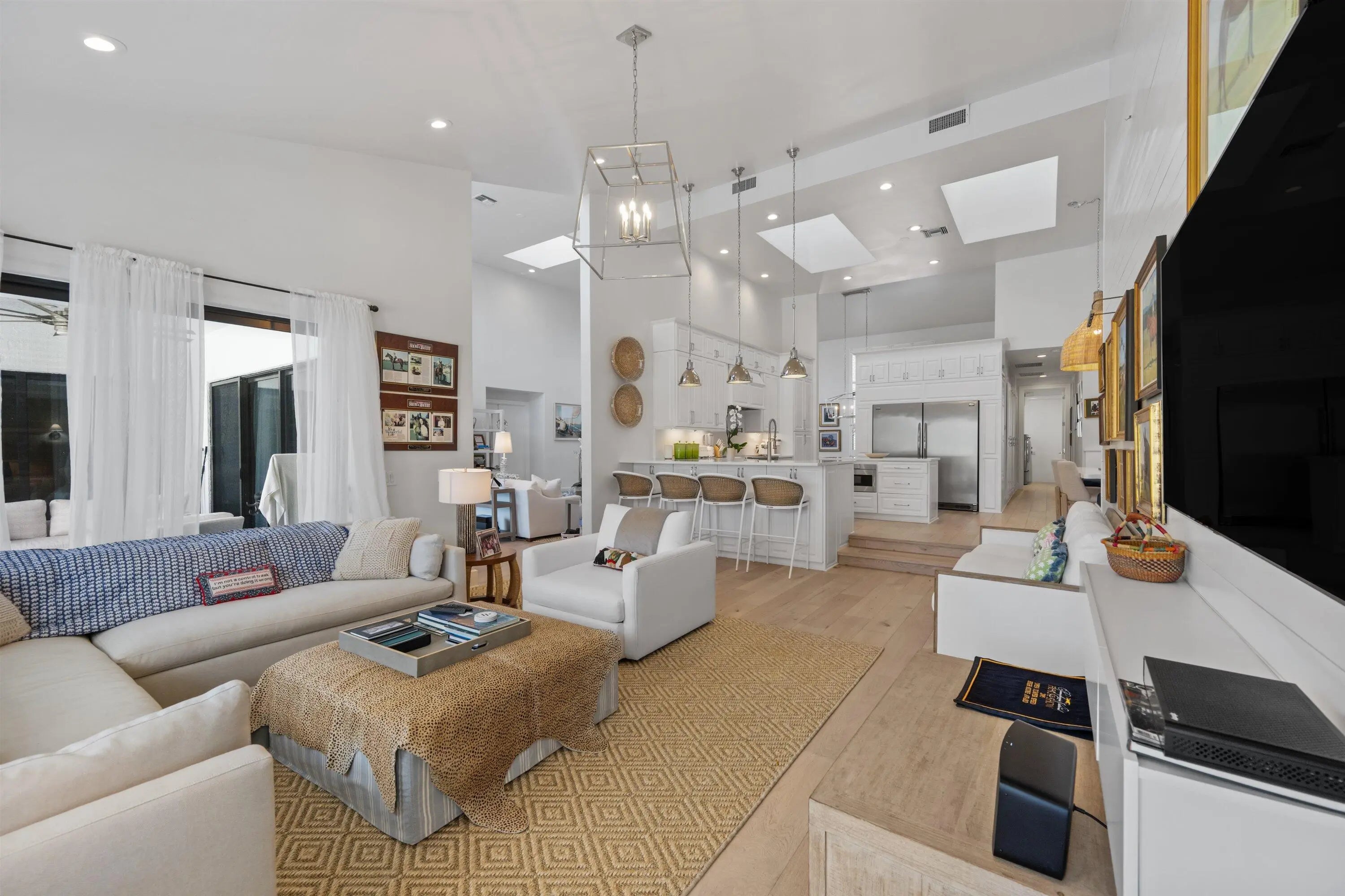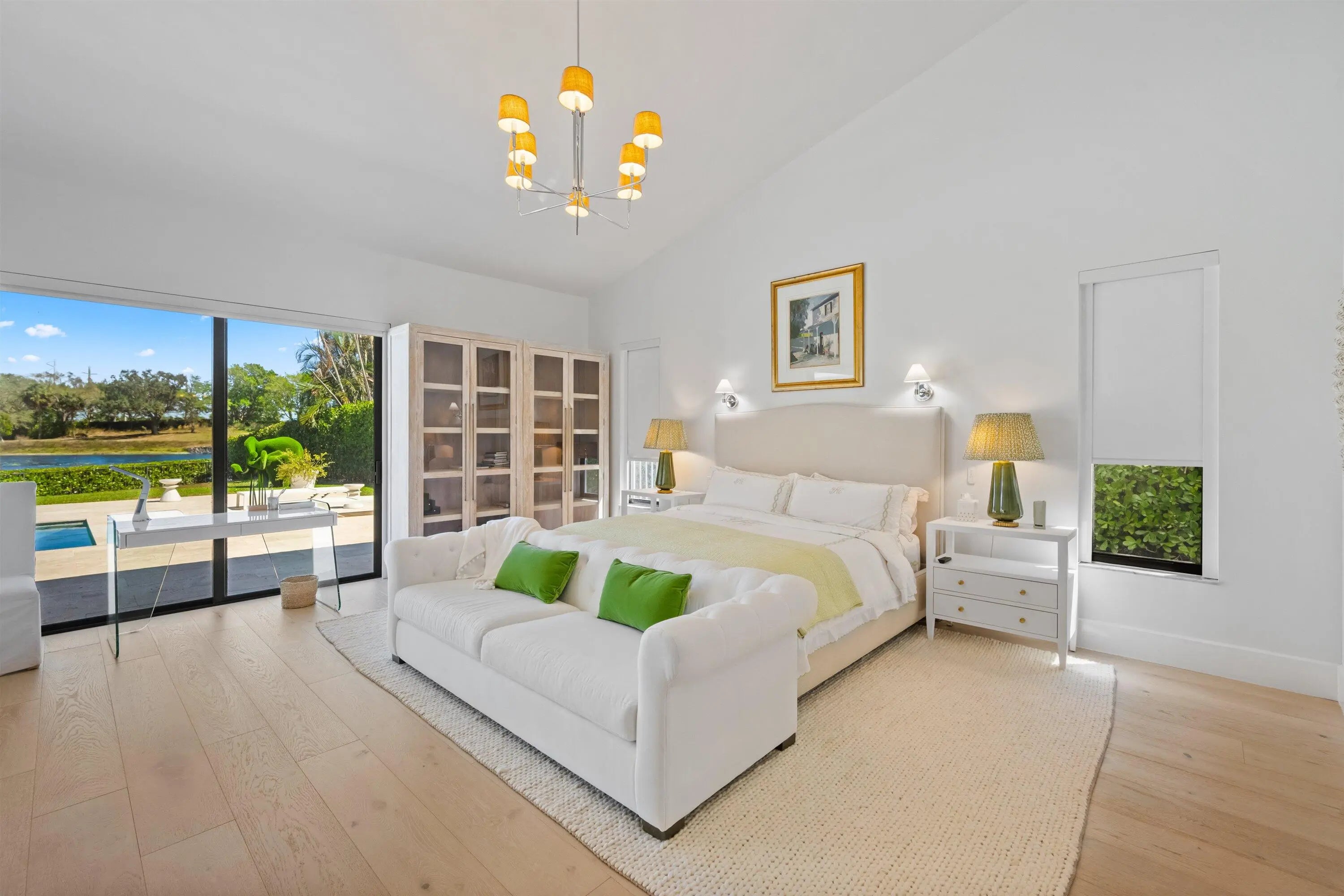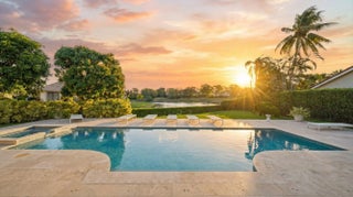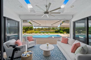 Located in the desirable Isle Brook neighborhood of Palm Beach Polo, this beautifully reimagined waterfront residence offers refined modern living with exceptional privacy. Featuring 4 bedrooms and 5 full bathrooms, the home is offered furnished and move-in ready.Soaring vaulted ceilings, skylights, and expansive windows fill the interiors with natural light, complementing the crisp neutral palette and sophisticated finishes throughout. The home has been upgraded with wood flooring, adding warmth and continuity to the open-concept design. The layout flows seamlessly into a well-appointed chef's kitchen with quartz countertops, custom cabinetry, a center island, and professional-grade stainless steel appliances.