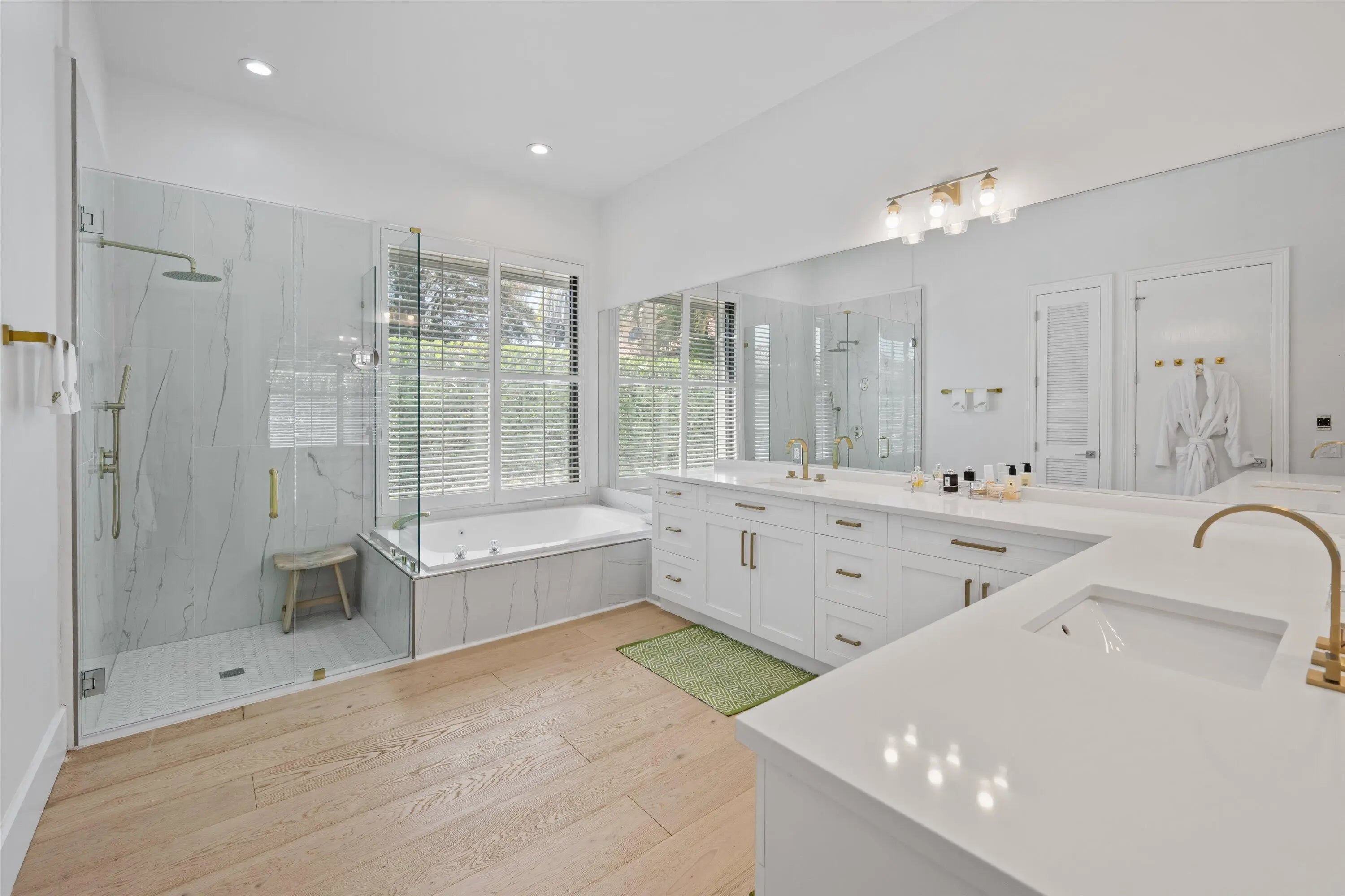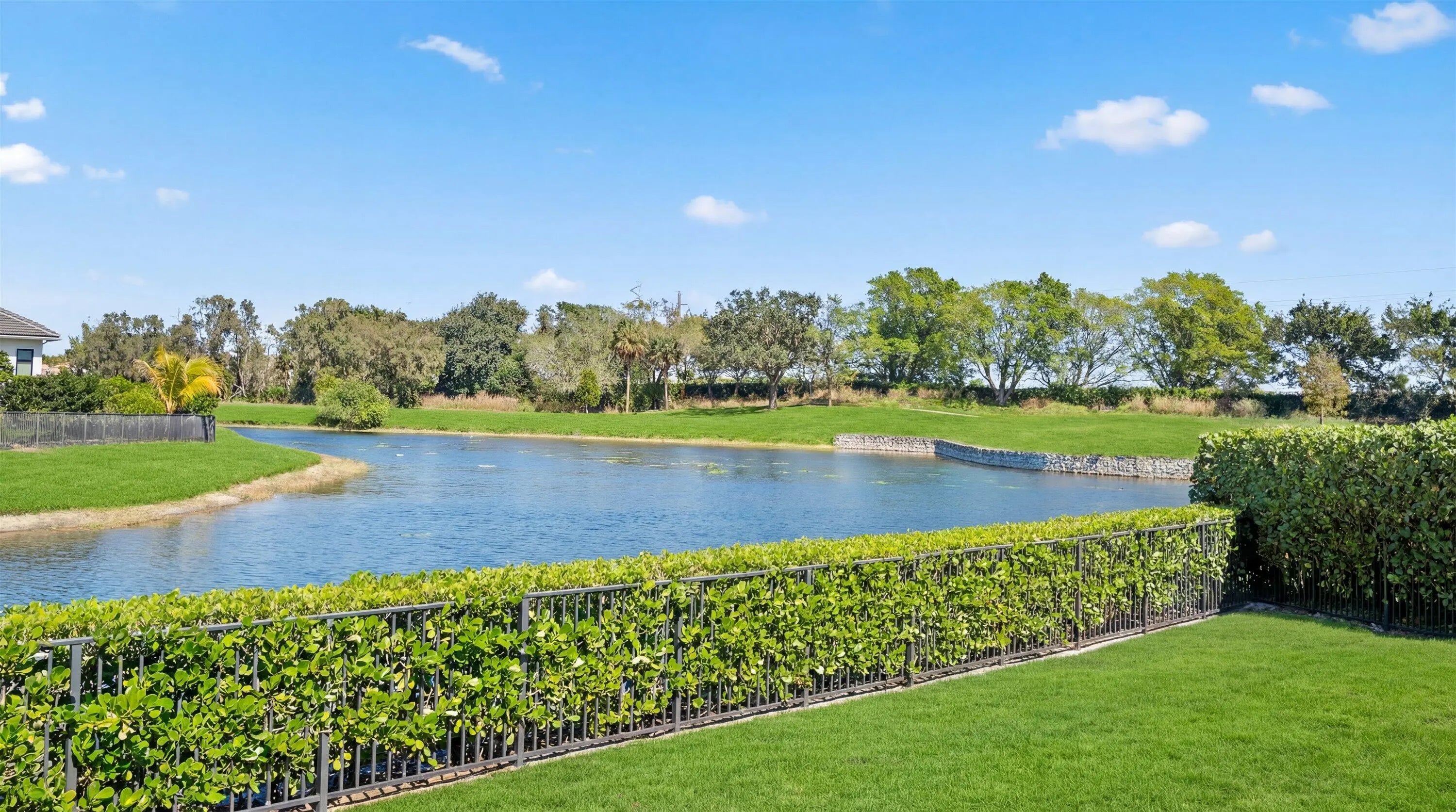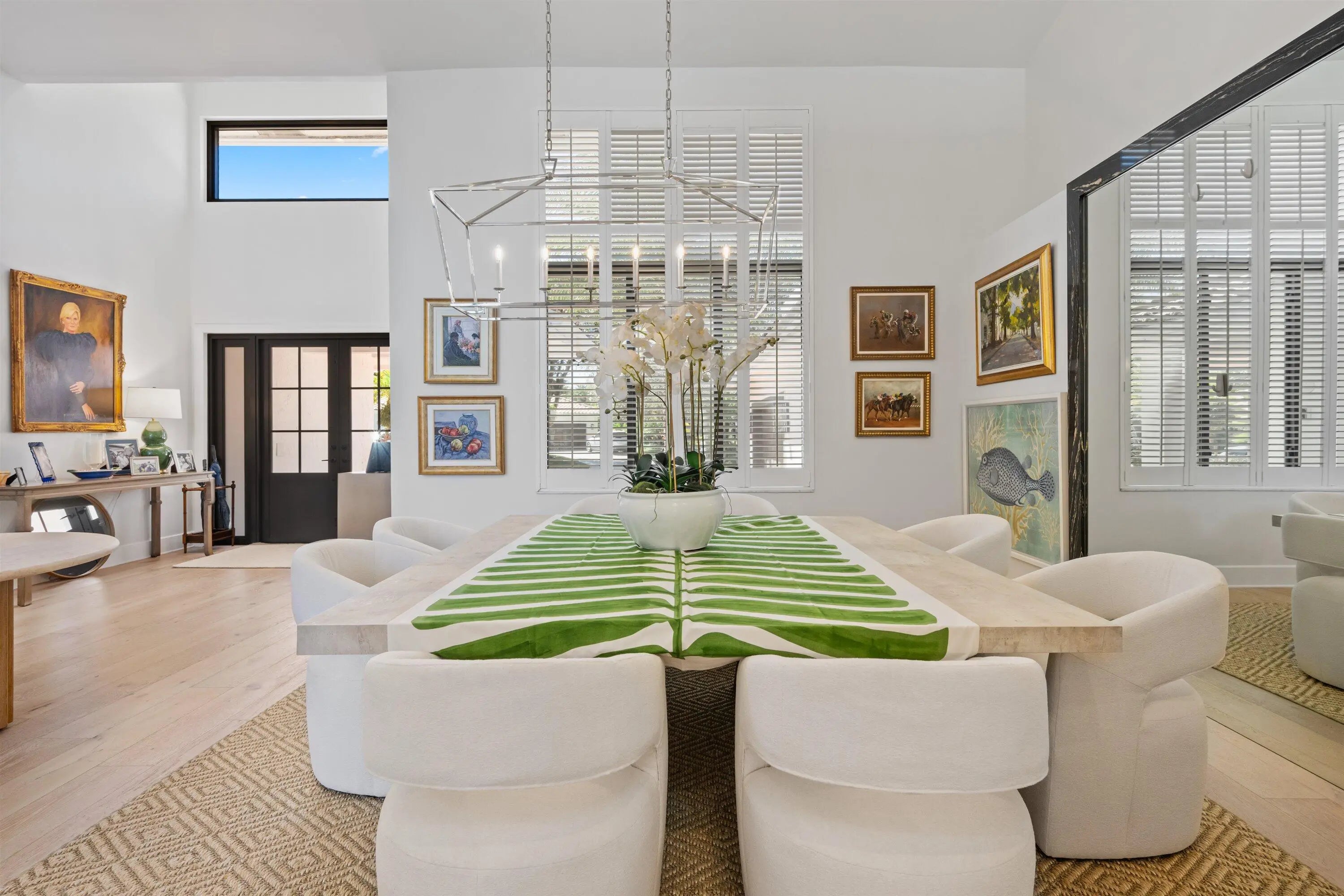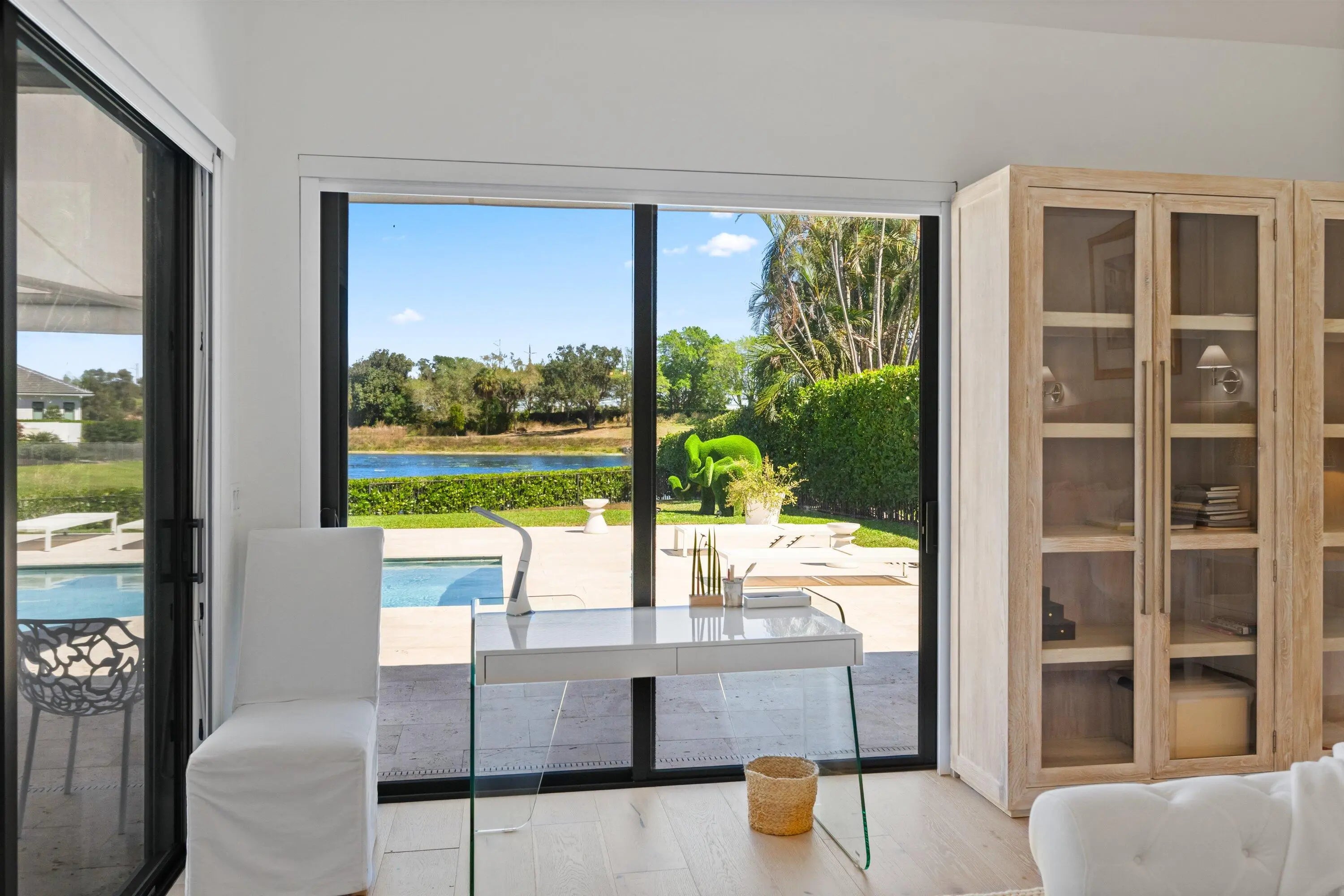 Located in the desirable Isle Brook neighborhood of Palm Beach Polo, this beautifully reimagined waterfront residence offers refined modern living with exceptional privacy. Featuring 4 bedrooms and 5 full bathrooms, the home is offered furnished and move-in ready.Soaring vaulted ceilings, skylights, and expansive windows fill the interiors with natural light, complementing the crisp neutral palette and sophisticated finishes throughout. The home has been upgraded with wood flooring, adding warmth and continuity to the open-concept design. The layout flows seamlessly into a well-appointed chef's kitchen with quartz countertops, custom cabinetry, a center island, and professional-grade stainless steel appliances.